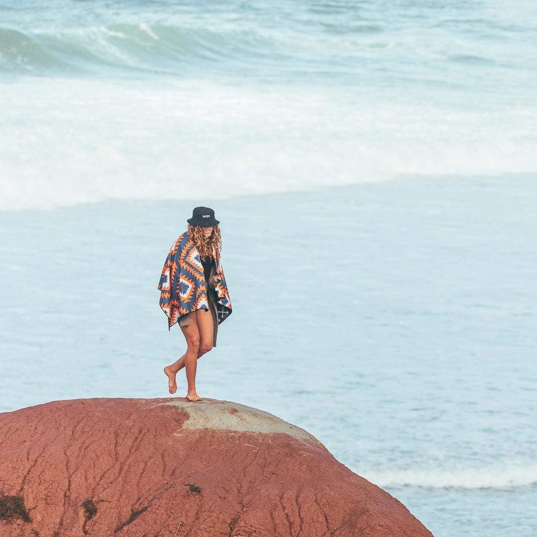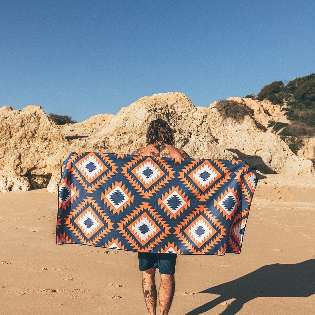 We designed our sustainable, sand free towels with a proprietary weave that creates greater surface area, leading to faster evaporation and rapid drying times. If you zoom in, you might be able to see the "waffle" texture on our towels that we use to create that extra surface area. Our towels are still ultra absorbent (they're able to absorb more than a liter of water at once), but they also release that water into the atmosphere quickly.